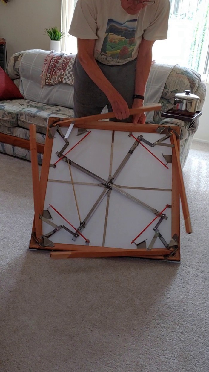See youtube.com/@lowellmcdaniel for half minute video of the prototype legs opening and closing. The legs on this table are connected by linkages making them move simultaneously. Picture 5 is the QR code you can scan with your smartphone camera to see the prototype video. Picture 1 shows that the moment arm is nearly as long as theoretically possible for maximum stability. Picture 4 shows the start of the leg opening process. Picture 3 shows the locking and unlocking processes. Picture 2 shows the table deployed and supporting a load. An OpenScad program representing all of its parts fully assembled in 3D and the spreadsheet feeding it are available on request. The design is mathematically described and so can be precisely modified , not arrived at by trial and error.