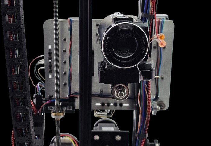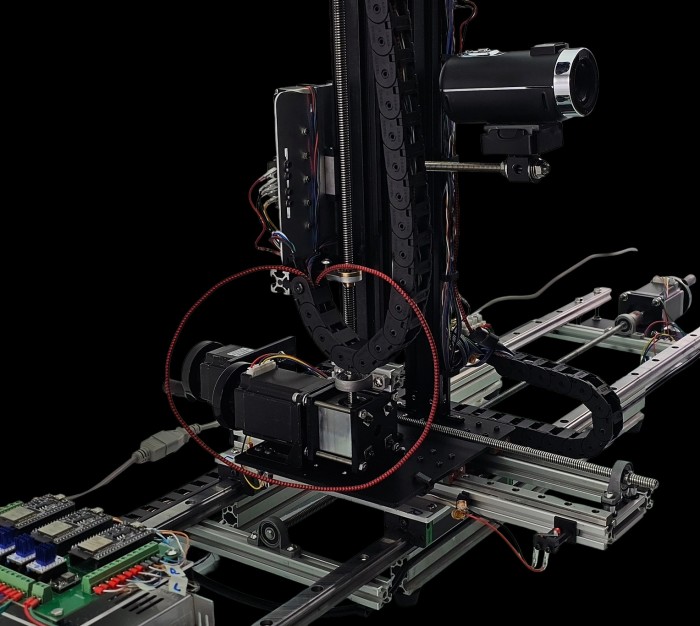 Remote controlled 5-axes motorized slider with camera focused on the object while sliding:
