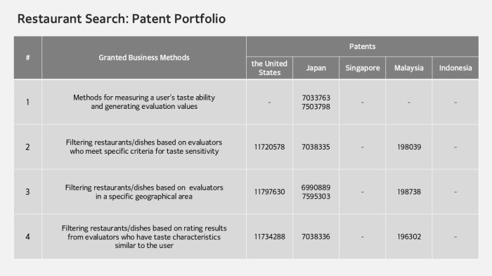 This portfolio provides the foundational technology—with 59 granted patents in the United States, Japan, and key Southeast Asian markets (Singapore, Malaysia, Indonesia)—to hyper-personalize the digital food service experience. It allows any platform to dynamically reconstruct menus for each individual user and to power a new generation of search that moves beyond anonymous reviews.