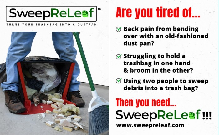 I was a Residential Contractor for 40 years and I hated having to use 2 guys to sweep up the jobsite debris, so I came up with SweepReLeaf. I am now 70 years old and out of energy. I want someone to take this and run with it. It should be in Home Depot next to the Husky Contractor Clean Up bags. It will sell millions! Contractors, Landscapers, Homeowners and their family members (for gifts!) will see the value and it will become a commonly owned tool, like a broom and a dustpan.