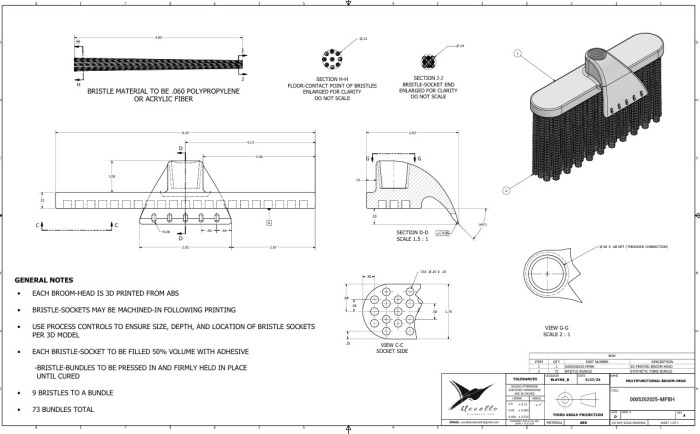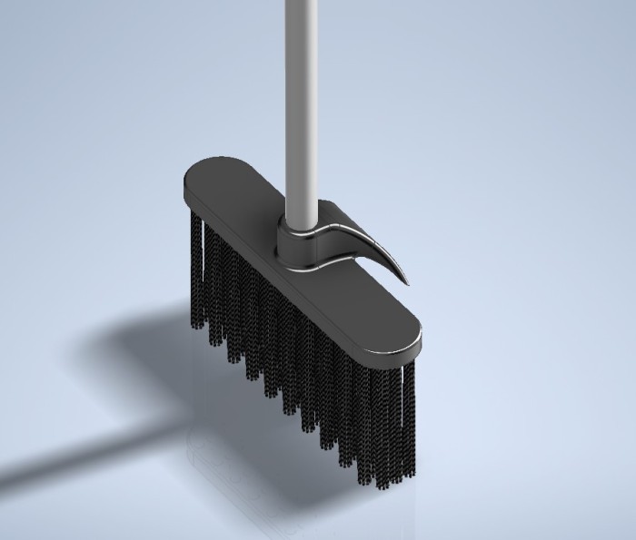 Each MFB is fashioned with bristles and, having universal female threads, is designed to fit most all types of broom sticks. The MFB is made from ABS via Plastic Injection Molding (PLM) or 3D printing. ABS is an ideal material due to its availability, mechanical properties, and cost effectiveness. ABS resists wear and deformation under stress making it the choice for this application.