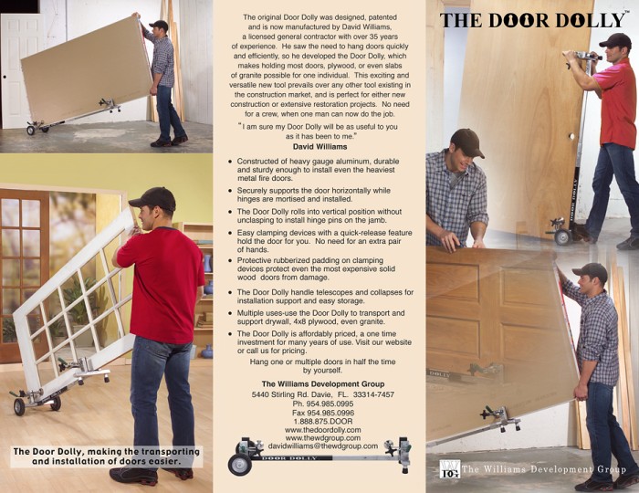 I am a Florida State General Contractor with over 40 years’ experience. While remodeling the Miami International Airport Hotel, my company’s part of the contract was to hang over 1400/3070 solid core fire doors at 147 lbs. each. I had to have two carpenters to hang these heavy doors. I made a door holder out of wood to hold the door while hinges were mortised and installed. One of my carpenters said if this door holder had wheels so we could roll it into place. (Necessity is the mother of invention). With a lot of trial and error, The Door Dolly was invented.