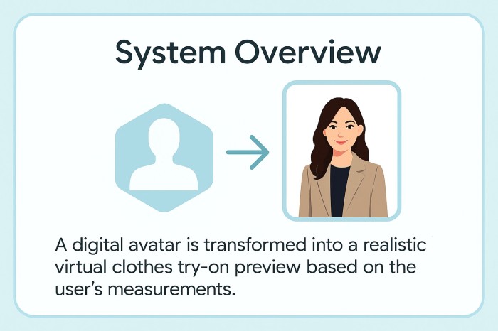 This invention relates to a 3D avatar virtual try-on system that automatically generates a lifelike digital avatar using a user’s body measurements and photo data. The system allows users to visually confirm how clothing will fit and look on their real body before purchase.