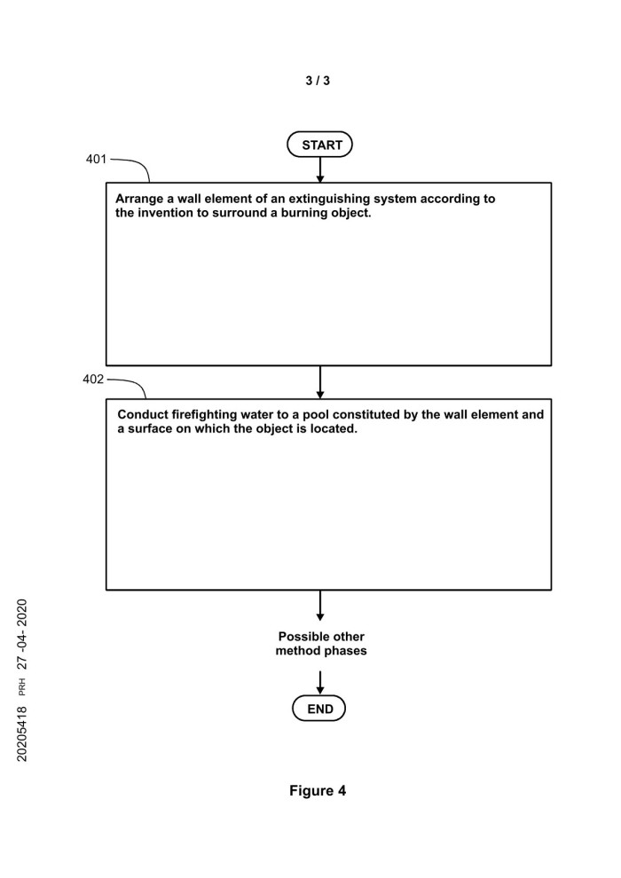 An extinguishing system comprises a wall element (101) for surrounding an object (112) on fire. The object can be for example an electric or hybrid car that comprises a battery. A lower edge of the wall element is configured to provide a sealed joint between the lower edge of the wall element and a surface (113) on which the object on fire is located. The wall element and the surface constitute a pool that can be filled with firefighting water to extinguish the fire in the object.