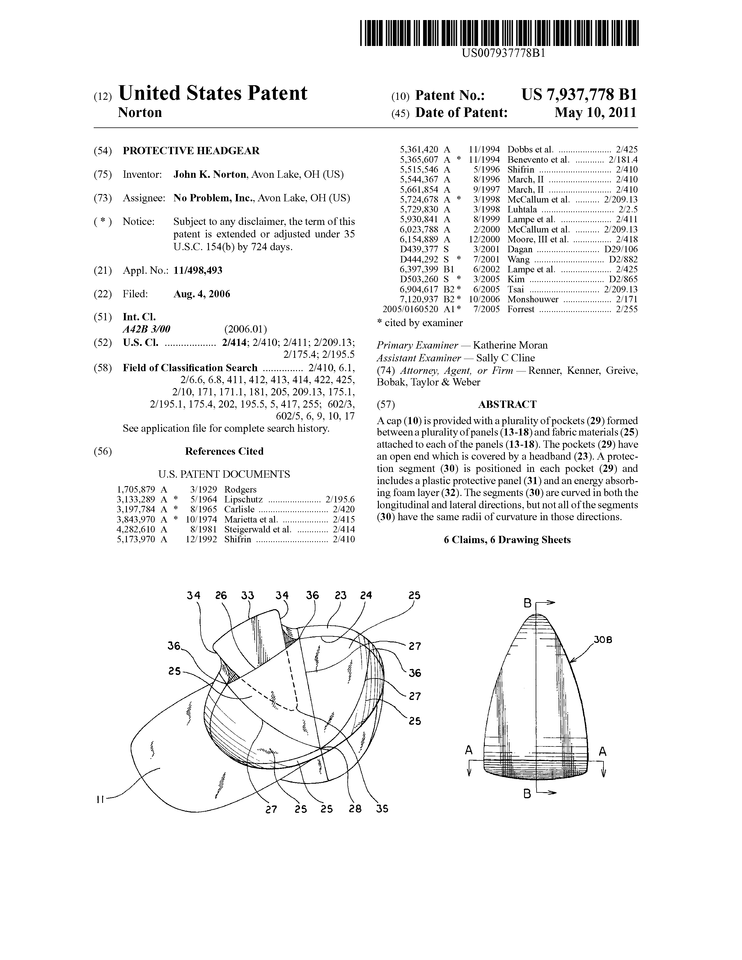 Please visit our page at rocklidcaps.com to view the patents and descritions. A cap (10) is provided with a plurality of pockets (29) formed between a plurality of panels (13-18) and fabric materials (25) attached to each of the panels (13-18). The pockets (29) have an open end which is covered by a headband (23). A protection segment (30) is positioned in each pocket (29) and includes a plastic protective panel (31) and an energy absorbing foam layer (32). The segments (30) are curved in both the longitudinal and lateral directions, but not all of the segments (30) have the same radii of curvature in those directions.