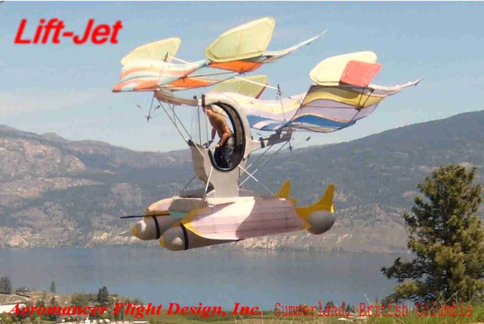 A Vertical Take-off and Landing (VToL) air-vehicle, based on the easy-to-fly, intuitive "tilt-to-control" flying platforms of the 1950's, and made safe by virtue of an array of "descent-vanes". Also referred to as a "parachute-wing" this feature makes the Lift-Jet virtually crash-proof, from any altitude. Even in the event of a complete loss of power, this vehicle automatically descends vertically, with a ground impact that is actually softer than that of an average sports parachute. Besides safety, one problem with the old "Hiller"-type Flying Platform-was poor performance and low airspeeds. This problem is also rectified by the Lift-Jets "parachute-wing" --which acts exactly like an ordinary, high-lift ultralight-airplane wing during forward flight. The result is a useful payload capacity, trip range and duration, and a top speed of about 60 mph--all of which makes the Lift-Jet a practical utility vehicle. The Lift-Jet is of relatively simple construction, using fabric and aluminum-tube wing-vanes and lifting disk, and conventional composites for fueselage and landing floats. Twin 2-cycle engines of about 35 hp. each drive counter-rotating props through a simple chain drive. Instruments and electronics are kept at a minimum, resulting in a rugged vehicle suited to use in remote areas. Because this vehicle is not only safe--but SELF-EVIDENTLY safe, (just as with the popular "parasail" concessions) it has the potential to become a mass-market phenomenon. Initially, it will appeal to adventurers and resource-workers in remote areas but as it develops a good safety record, other recreational and non-pilot users will develop other uses, including that of a commuter-vehicle.