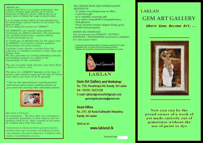 Lakvidu Holdings (Private) Limited is Sri Lankan organization, that produces art works made entirely out of natural gem stones of different colors , without the use of paints, dyes or any pencil marks.
