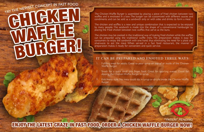 The Chicken Waffle Burger is a food invention meant to be a truly fast food item. It is fried chicken sandwiched between two waffle pieces. Consumers normally have to use a plate and a set of cutlery to eat either one of these dishes. However, by combining the two into an easy to eat sandwich, the use of plates is eliminated. Best of all, consumers can eat it using one hand.
