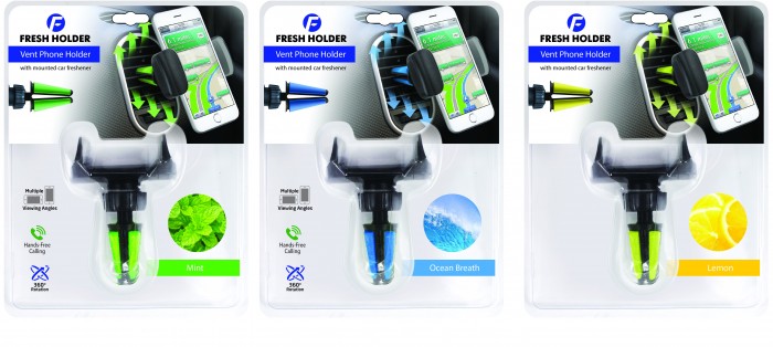 Automotive phone holder with integrated air freshener helps you declutter your car by combining two necessary accessories in one. A phone holder that doubles as a car freshener. So simple, it's shocking it hasn't been done before. Just place the phone holder on your car's AC vent and enjoy the scent of the fragrance strips you choose to attach to it. Automotive phone holder with integrated air freshener has space for up to 4 fragrance strips so you can mix and match to achieve the perfect scent. All 4 fragrance are replaceable. The users could replace them after the scent will be gone.