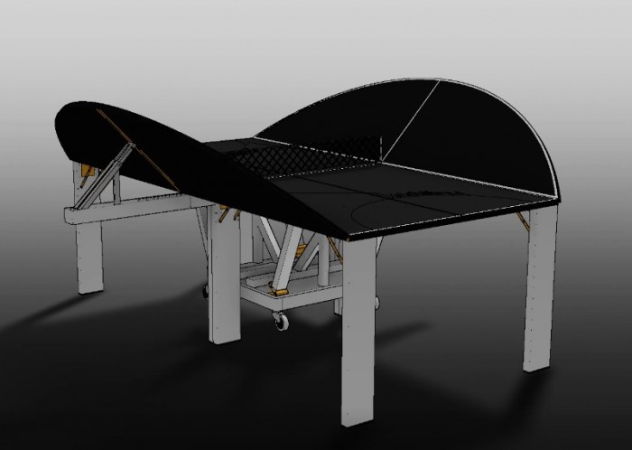 This variation of Table Tennis gives players the ability to ricochet ping pong balls off the arcuate wings which run the length of the table on both sides. The wings can be set to varying angles with respect to the main table surface (including level). This encourages new strategies on the part of the players. The wings can be utilized to change the dynamics of the game or the players can opt to play as they would on a traditional table. There is also the inclusion of semicircular inserts at the ends of the table. When an insert is removed on one end of two tables, the result is a circular void where a third player can enter to play against players on the ends of the two tables. The table(s) wings can also be configured level as a working or eating surface. Folds compact. Designed to be lightweight and sturdy. Eat, Work, and Play on this Table Tennis with Wings.