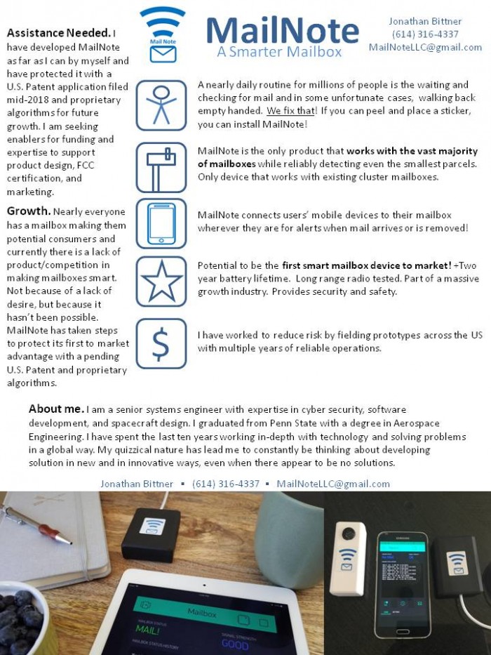 We assess MailNote has potential for substantial growth as part of the massive “Internet of Things” industry. Nearly everyone has a mailbox making them potential consumers. Currently there is a lack of competition in making mailboxes smart. MailNote has taken steps to protect this first to industry advantageous with a pending U.S. Patent and proprietary algorithms.