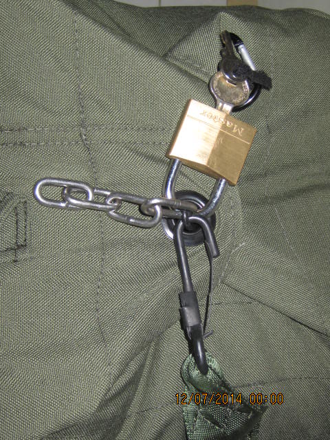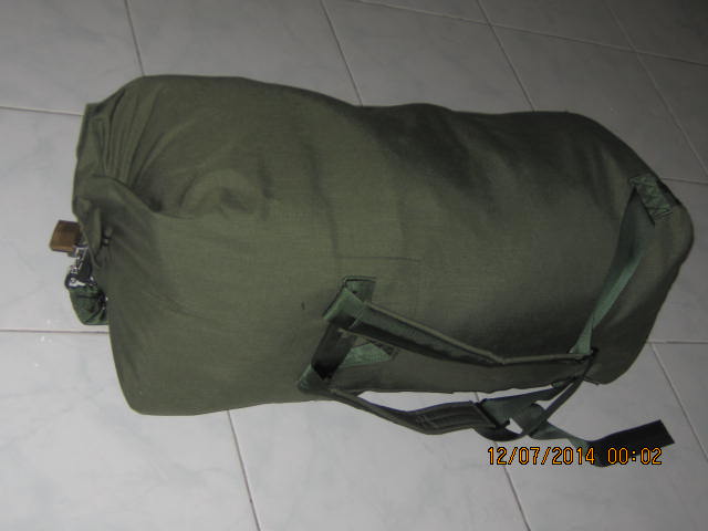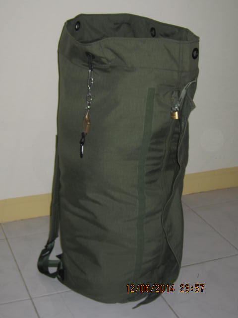 Broadly, the bag may be a drab heavyweight Cudara double strap duffle bag with: (1) a flap-covered and water proofed zipper along the length of the bag; (2) a light fabric bottom so that ownership identity information may be readily stenciled thereon the light fabric; and (3) a chain or other lock on the top flap so that the bag may be locked or chained to a secure location.
