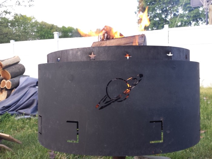 A rotating fire pit is provided. The fire pit includes a base for supporting a fire source. The fire pit further includes an enclosure circumscribing the fire source. The enclosure has a wall that includes a decorative cutout. The fire pit further includes a drive mechanism that drives relative motion between the base and a ground surface.