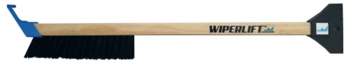 The product invention is a automobile snow brush design that has a hook which enables you to lift and lower your windshield wipers on your vehicle. This helps to clear snow and ice away from hard to reach areas at the base of your windshield. It also has a feature on the hook which scrapes away ice build-up on the wiper blades. The patent covers several iterations.