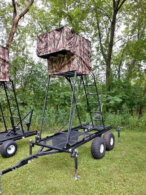 Can be towed at speeds up to 70 MPH. Sets up in minutes, using a cable system. Elevated, the hunting platform can be 8ft or 10ft from ground level, depending on the model. The removable Camo Enclosure is made from 600 Denier material, waterproof and wind proof.
