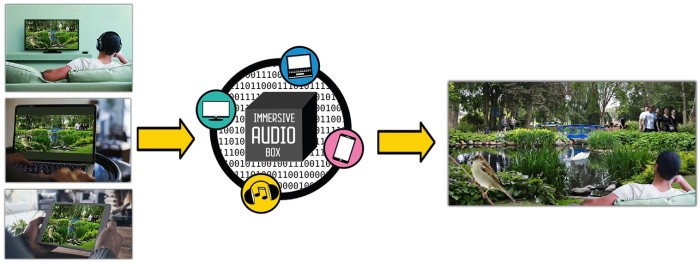 A method and system for creating binaural immersive audio for an audiovisual content. The method includes steps of receiving the video and the audio; selecting at least one frame of the video; analyzing the selected frame of the video to identify audio contributing object within the frame; analyzing at least one portion of the audio; associating the analyzed audio with the corresponding identified audio contributing object within the frame; using the association to generate the binaural audio for the audiovisual content.