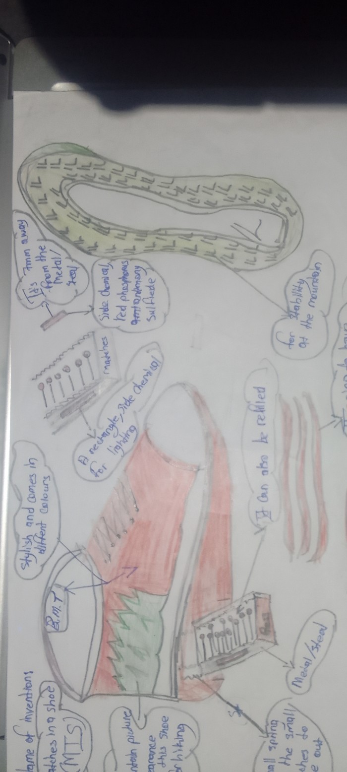 The invention it's going to help hiking people to have fire at camps by just pressing the button on the side of the shoe,you can also refill the the metal box.The reason I am saying a metal box,it's because I want it to be water proof,so that it can protect the side chemical (phosphorus) for better lighting.The shoe can also have stability to walk nice at the mountain and good for running