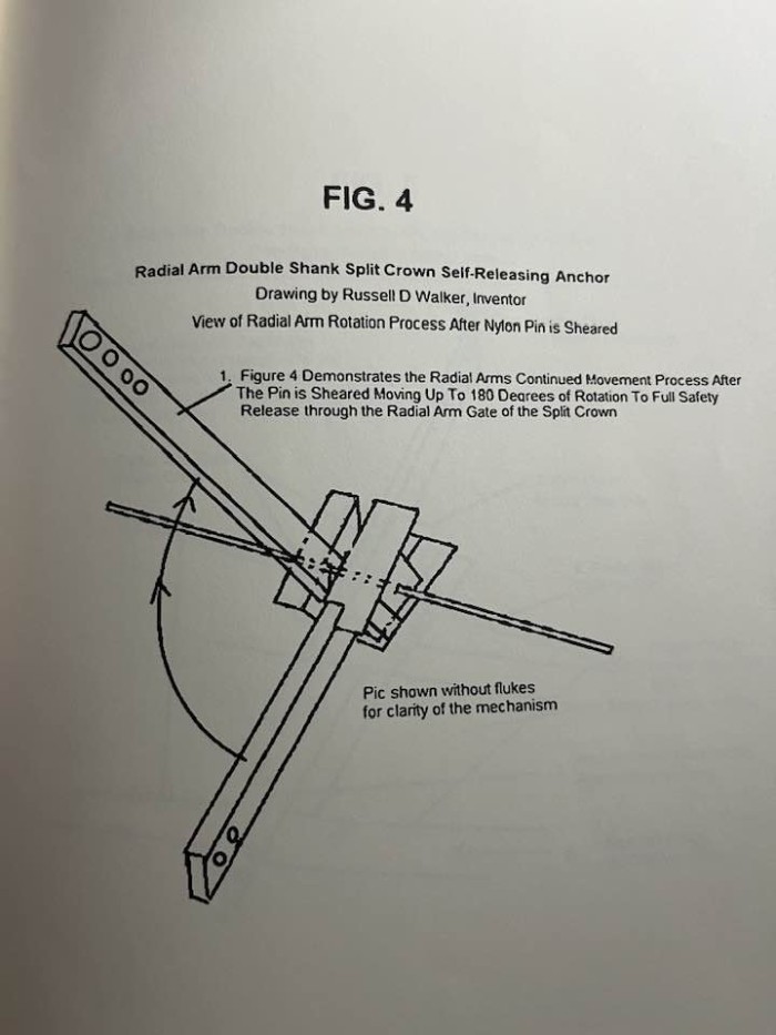 This is the Only Improved Patent ever issued on the most famous boating anchor in the World, known as The Danforth Fluke Anchor. It's innate, double shank, split crown, self releasing, mechanical action allows the anchor to be freed from any snag, at any depth, via a replaceable plastic shear pin between the the anchor shank and the 180 degree rotation of the radial arm of the anchor,