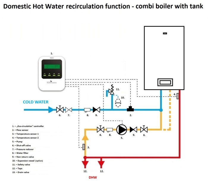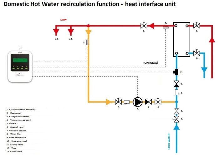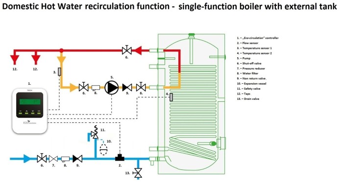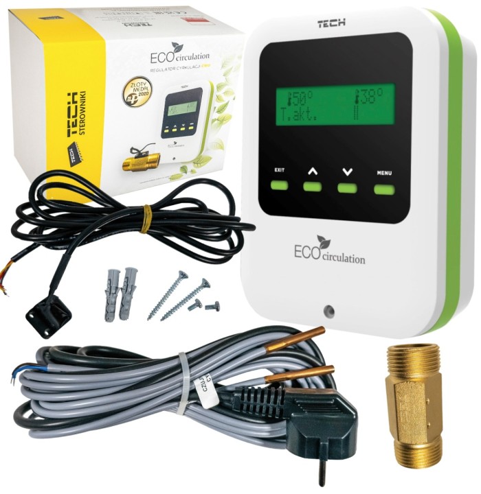 The circulation controller for domestic hot water (DHW) is designed to manage the DHW circulation system to match the individual needs of each user. It reduces the waiting time for hot water at the tap in the most energy-efficient way while ensuring user comfort. It controls the circulation pump, which speeds up the arrival of hot water to the tap when water is drawn, replacing the cooled water with hot water at the desired temperature in the circulation loop and at the outlet point. The control system monitors the user-set temperature in the circulation loop and only starts the pump when the temperature drops below the set point, preventing heat loss in the DHW system. It saves energy, water, and extends the life of system components like the circulation pump. The circulation system activates again only upon the user's request for hot water and a simultaneous drop in the loop temperature. The device has all necessary functions to adapt to different DHW circulation setups. It can control hot water circulation and can also start the pump if the water heater overheats (such as in solar systems). The device includes an anti-blocking pump feature (to prevent the pump impeller from seizing), adjustable pump operation time, and can be individually programmed by the ser.