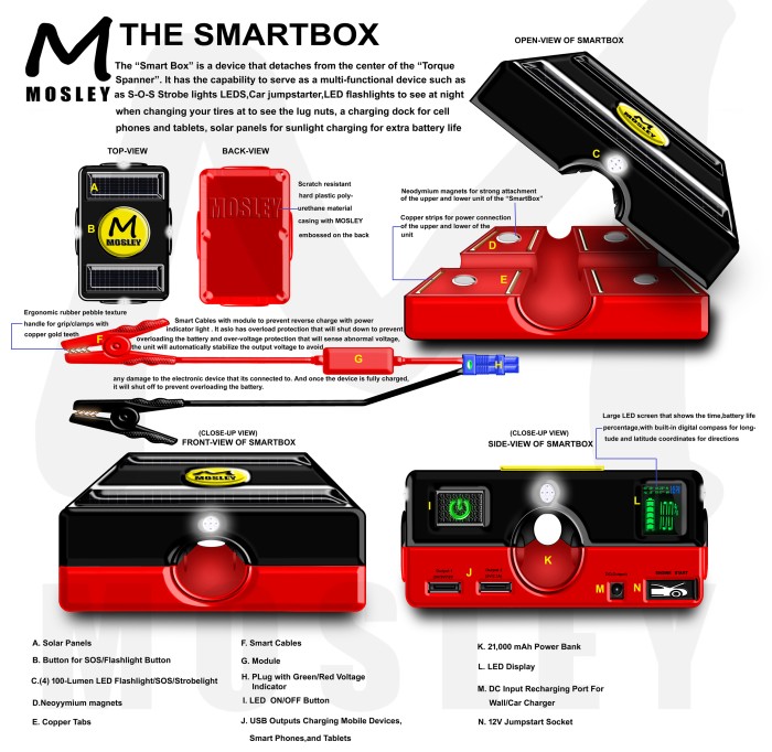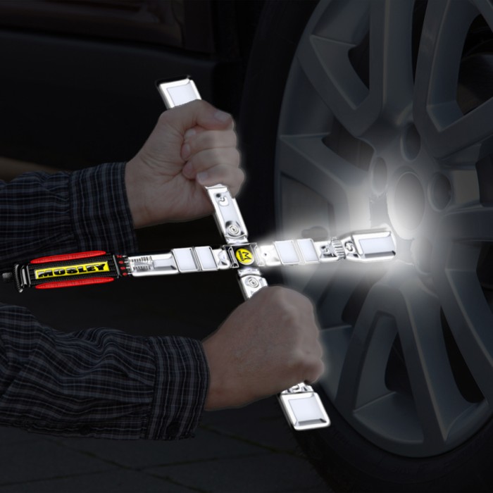 Often, the tire must be changed at night and dark, and the user may lack proper lighting means. Changing the tire in the dark can be more difficult and risky because of the chances of the user getting injured. For example, the wrench may not properly fit around the lug nut and flip upon applying the torque. Or perhaps an oncoming motorist may not see alongside the road working on a vehicle. And not to mention. The universal wrench also is equipped with a detachable smart box in the middle that's solar powered for charging wireless pad's, cell phones, GPS Navigational System with longitude and longitude components, and a 12-volt jumpstart battery charger for boosting a vehicle off. Thus, a need is appreciated for a device that allows loosening and tightening the lug nuts easily and comfortably. The multipurpose and universal wrench further comprises a blinking strobe light to warn oncoming motorists when alongside the road,