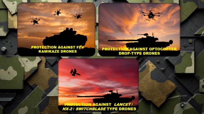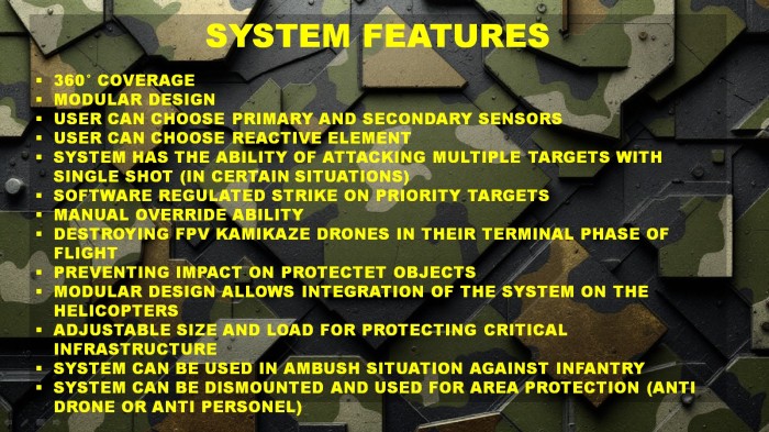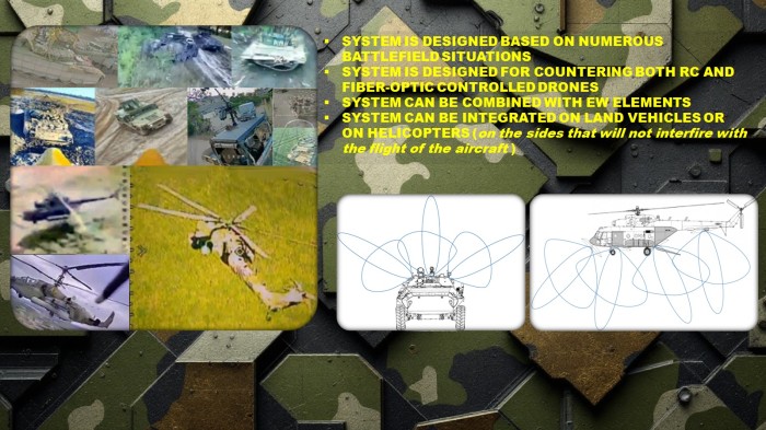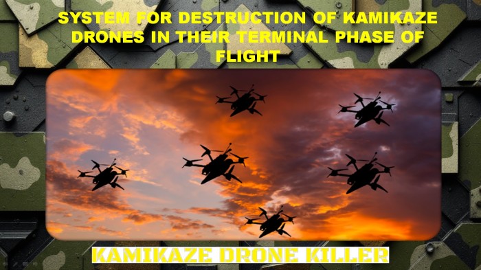 The system was developed with the intention of effectively destroying kamikaze drones in the terminal phase of flight, before hitting a defended object. It is suitable for installation on vehicles, helicopters (with minor modifications), and in general objects that can be the target of kamikaze drone strikes. Depending on the user's wishes, it is possible to create a basic or advanced product.
