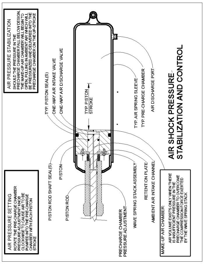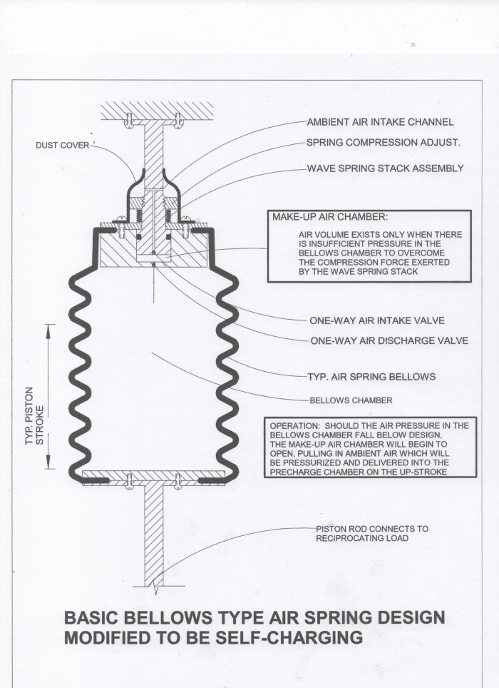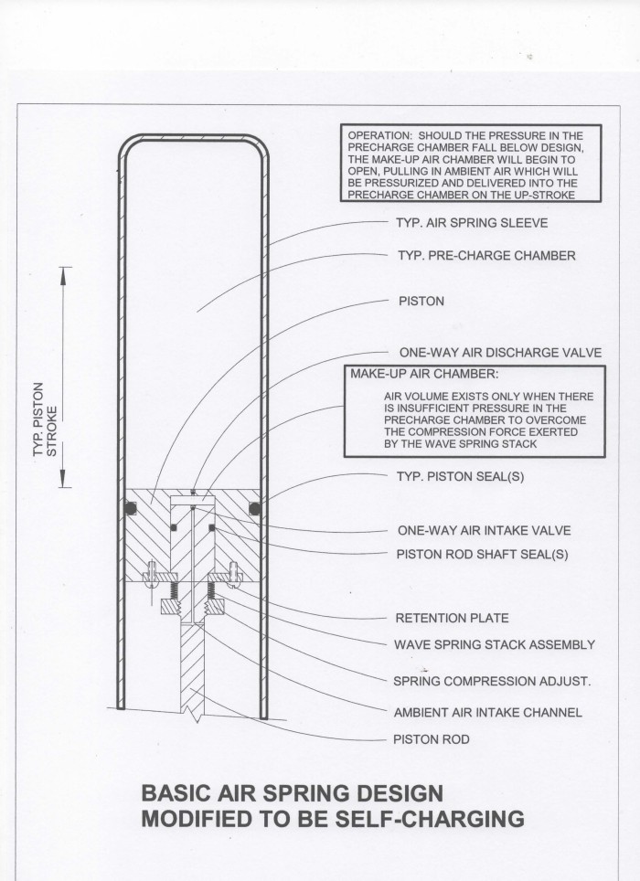 SUMMARY: Loss of pressure in the precharge chamber of a typical air spring assembly is probably the number one problem facing the use of air springs. The cited invention will both establish and maintain the optimum design compressed air pressure in a typical air spring’s pre-charge chamber. As indicated on the attached sketches, this goal is accomplished without tools or disassembly by the user. Standard operation of the air spring performs this function automatically without adversely affecting the required performance of the air spring, its physical size nor add appreciably to its overall weight.
