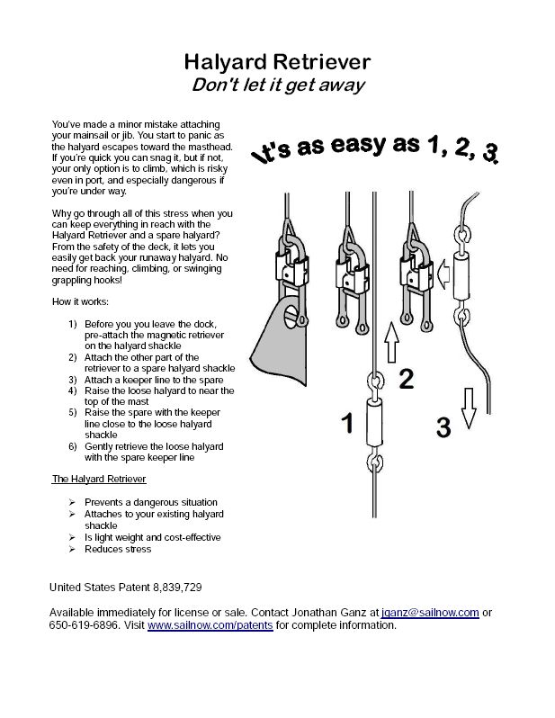 Lost halyards are a thing of the past with the Halyard Retriever. This ingenious tool lets you easily retrieve runaway halyards from the safety of the deck, eliminating the need for risky climbs or grappling hooks. Whether in port or underway, the Retriever ensures a quick and safe solution. (Sample Available!)
