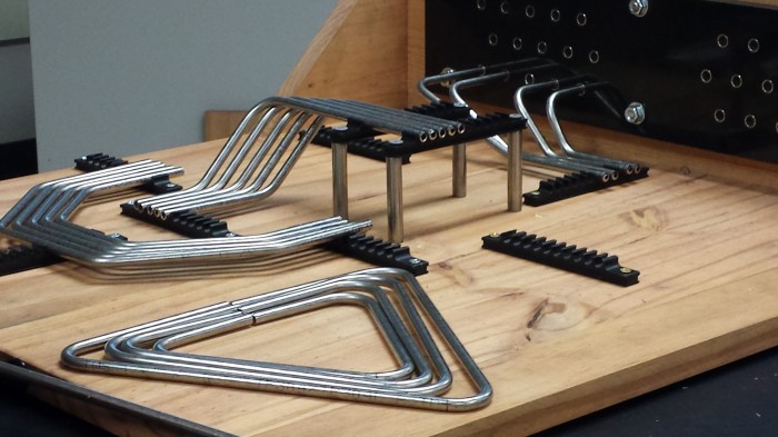 This patent contains 4 different styles of templates. They are used to lay out pipe, conduit, or tubing. With this method you can lay out all of your bends, any angle, before you proceed.
