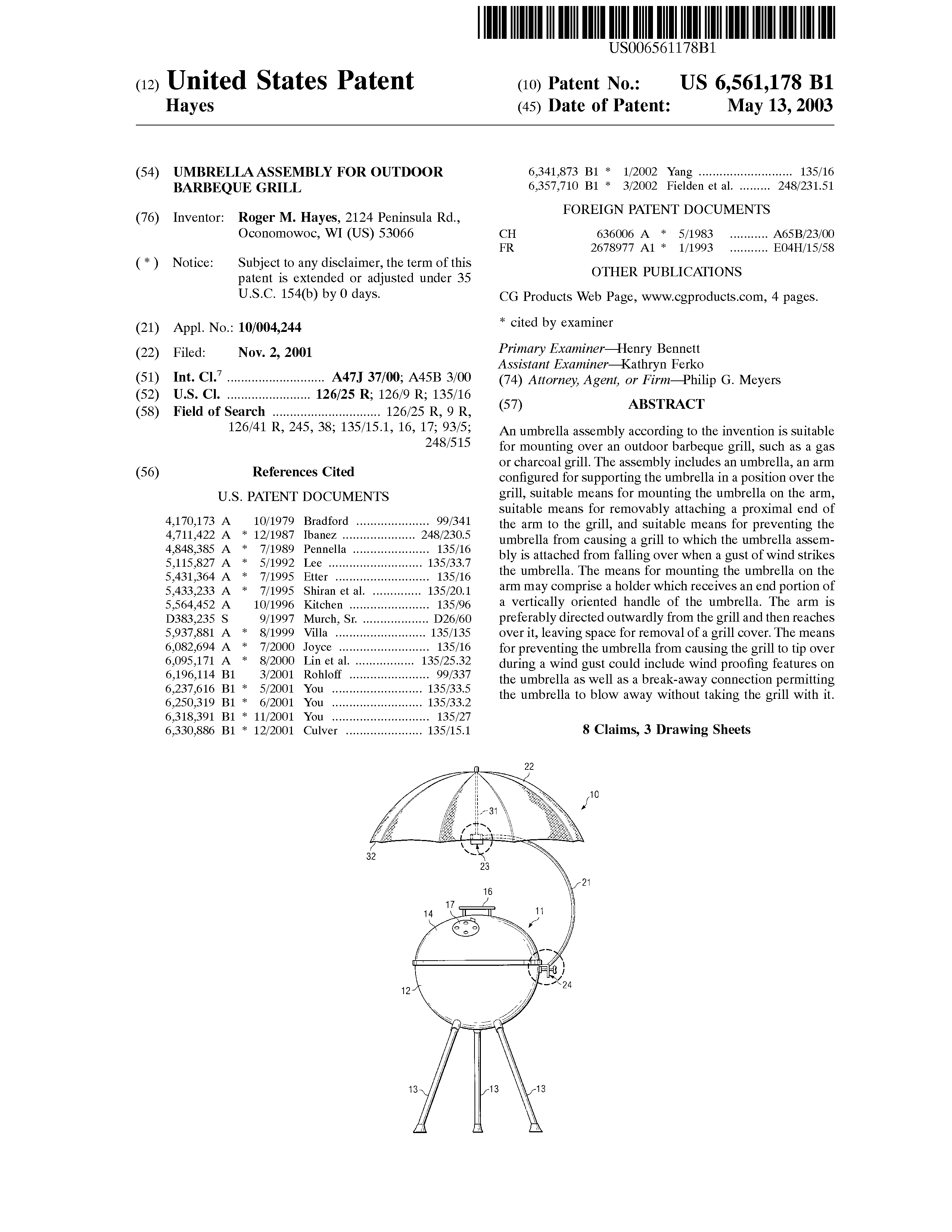 Financial informationMillions of Americans grill outside, and weather can have large impact on the family BBQ or tailgate. After years of grilling out in the rain, snow, or wind, I came up with my grill umbrella design. I've used a homemade prototype and patented the idea and design. The grill umbrella has been a side project for me for years. I am looking for a strategic partner or outright sale at this point, however, since I would like to retire and focus on family. The product has not been sold or marketed yet, so the potential is endless. Licensing possibilities with sports teams, beverage companies, colleges and universities would be fruitful. have a tremendous amount of research on the topic of the outdoor BBQ grilling consumer, and will share that with serious buyers.